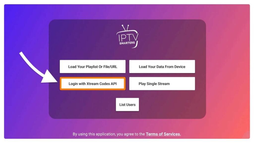 From the next screen, you will notice multiple options to Log Into the Smarters Pro. Now you need to choose Login with Xtreme Codes API which is the fast method.